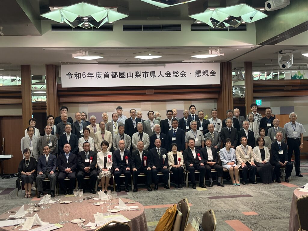 7月13日(土)山梨市県人会総会 投稿日: 2024年7月13日2025年2月10日 投稿者: staff 7 月13 日、コートヤード・マリオット銀座東武ホテルにおいて、首都圏山梨市県人会総会および懇親会が開催され約70 人が出席しました。本市出身者や市にゆかりのある方々と市民がお互いの情報を積極的に交換し、交流を図ることにより、ふるさと山梨市のさらなる発展に寄与することを目的としています。観光大使である小倉浩二さんによるシャンソンの歌唱も披露され、会場は大いに盛り上がりました。